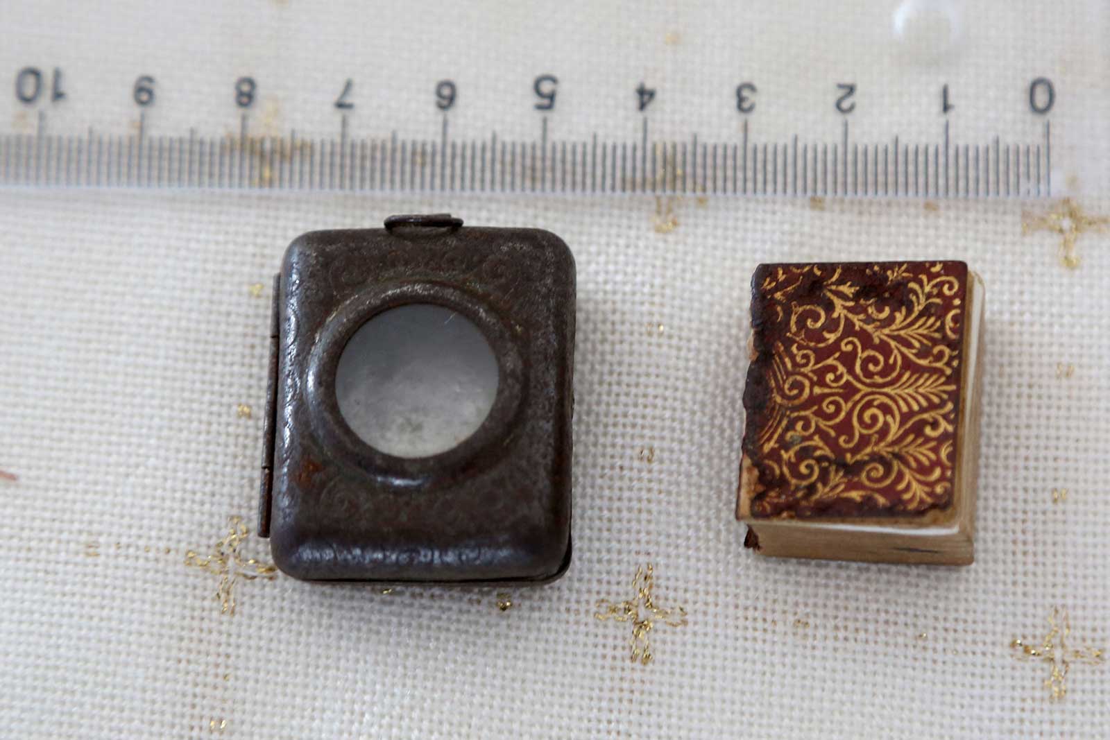 ويبلغ طول المصحف ذي الغلاف المخملي المطرّز بالذهب سنتيمترين ونصف سنتيمتر وعرضه سنتيمترين، وسمكه سنتيمتراً، ولا يمكن قراءة النص إلا باستخدام عدسة مكبرة صغيرة مدمجة في غطاء الصندوق.